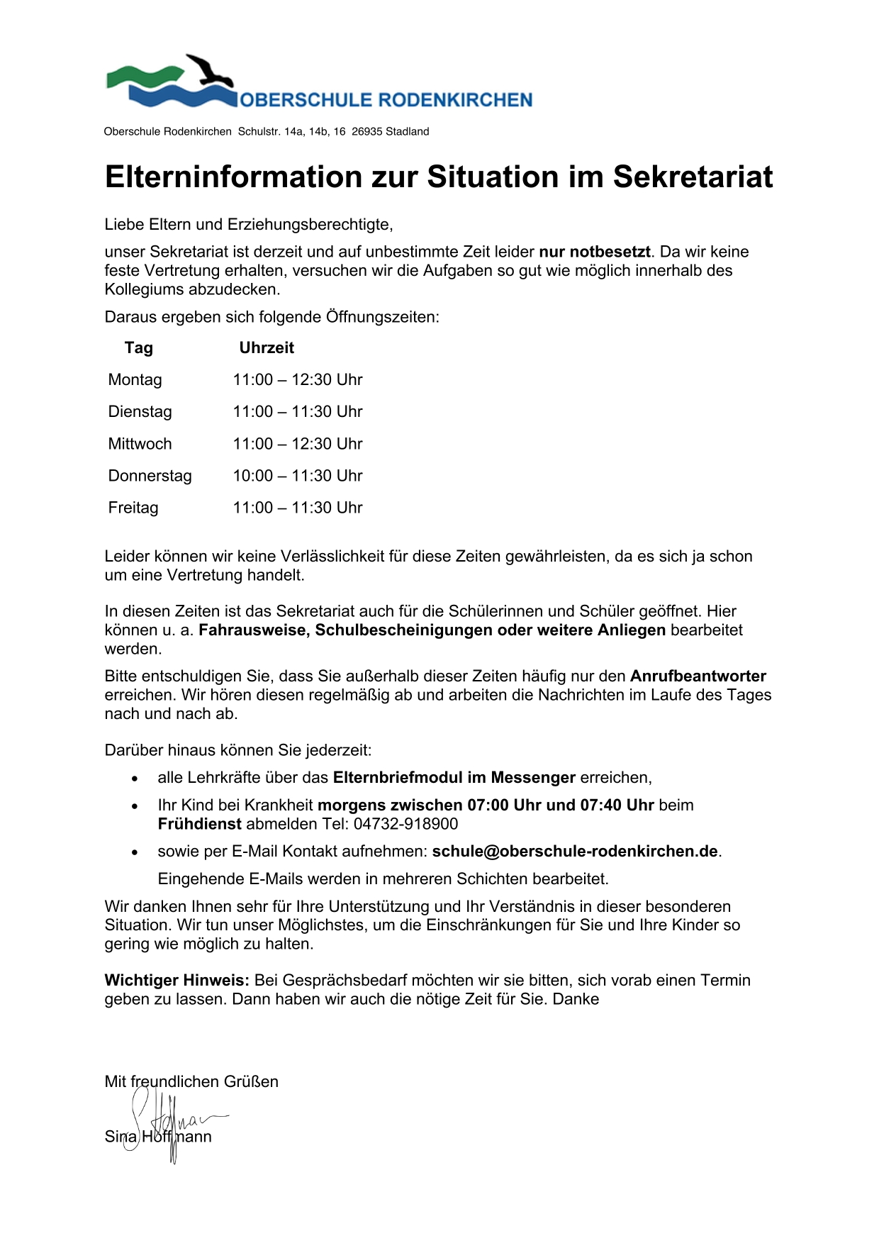Für alle Fragen rund um die Schulverwaltung wie Anmeldung, Schulbescheinigungen, Krankmeldungen, Terminvereinbarungen und vieles mehr, steht Ihnen unsere Sekretärin gerne hilfreich zur Seite!